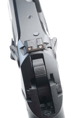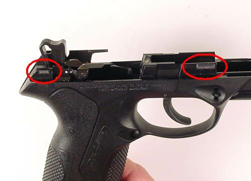 该枪安装有可更换的3点式机械瞄具,准星后面和照门缺口的左右两侧设有夜间瞄准用的白点,只要吸收微弱的光,就能持续发光30分钟。用户也可以自己购买和更换上不需要吸收光线的氚光点瞄具。