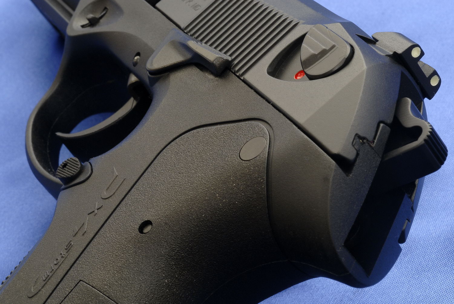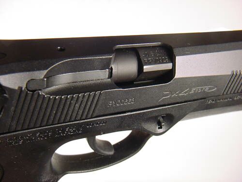 Px4“风暴”手枪与“美洲狮”手枪最大的不同是底把由玻璃纤维强化的工程塑料加工成型,防腐蚀性和耐高低温性能好,重量也很轻。底把在扳机护圈前的底把两侧都有分解按钮。要拆卸套筒和枪管时,要先清空手枪,然后向内推按钮,然后把套筒向前从底把上拉出来。空仓挂机柄在底把左侧。