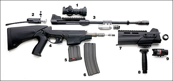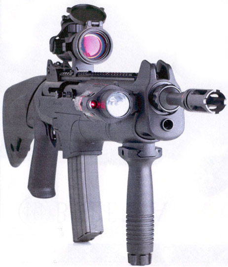 伯莱塔Rx4“风暴”步枪最先在2006年公布,是“Xx4风暴”系列中最新的一种。这把步枪上带有很深的伯奈利公司产品的影子,而且看起来就好像是用不同枪上的部件装配起来的。实际上就是这样子,由于伯莱塔公司已经买下了伯奈利公司,因此他们能直接拿到伯奈利的设计和零件。伯莱塔Rx4步枪其实就是把发射中间口径弹的伯奈利R1猎枪改装成一把发射小口径弹的半自动步枪,直接使用了伯奈利R1步枪机匣和导气系统,但在机匣下面加上了一个聚合物的弹匣插座,这就能直接使用北约4179标准弹匣(通用AR-15/M16弹匣)。枪托直接采用了伯奈利M4超级90霰弹枪的伸缩枪托。