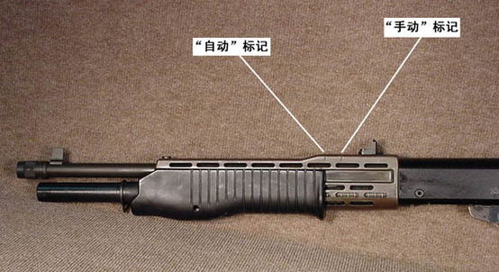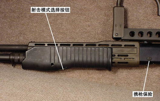 前托底部的射击模式选择按钮及装填口左侧的携枪保险,此图中的枪处于泵动装填模式