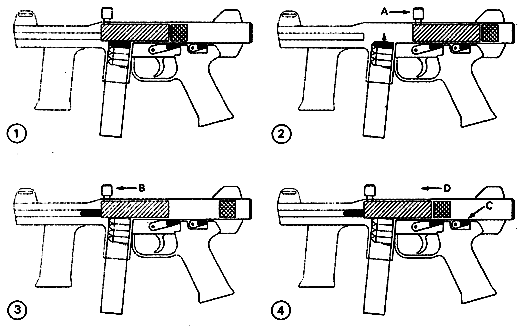幽灵M4冲锋枪的原理图:(1)装入实弹匣;(2)向后拉动拉机柄;(3)释放拉机柄,枪机复进,推第一发枪弹入膛,击锤停在后方;(4)压下解脱手柄“C”,击锤“D”到达前方位置,但不能击发膛内的枪弹,此时武器处于保险状态,只要扣压扳机即可击发。