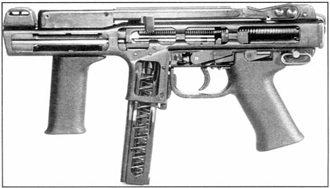 Spectre P手枪(见图5)——与卡宾型类似,也是只能半自动发射,也具有原型枪的基本特征,但没有枪托和前握把,并采用标准枪管。该枪除9×19mm口径型外,还有.40 S&W口径型(配35发4排弹匣)和.45ACP口径型(配32发弹匣)。但由于该枪的重心靠前,因此单手射击并不容易打得准。