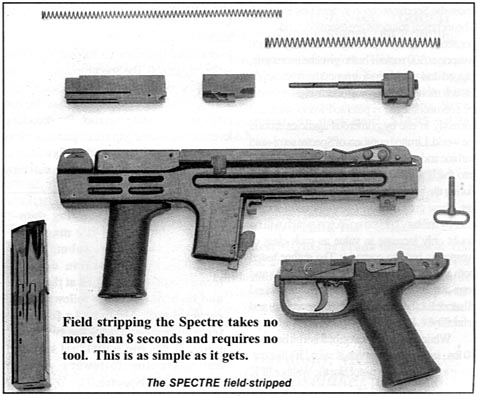 Spectre M4冲锋枪与大多数同时代的冲锋枪一样采用自由后坐式原理,但与众不同的是,它却是采用闭膛待击的。闭膛待击的优点是命中精度较高,但对于以连发为主的武器来说则是不利于散热。所以目前大多数的冲锋枪都采用开膛待击,但也有少数如H&K MP5、柯尔特9mm冲锋枪采用闭膛待击。