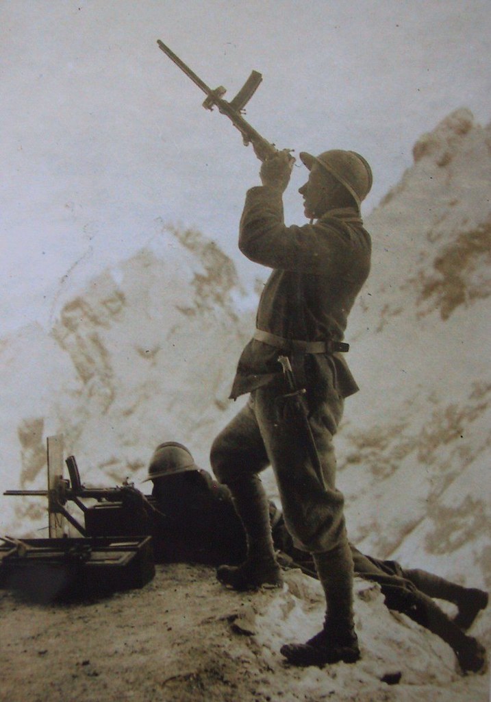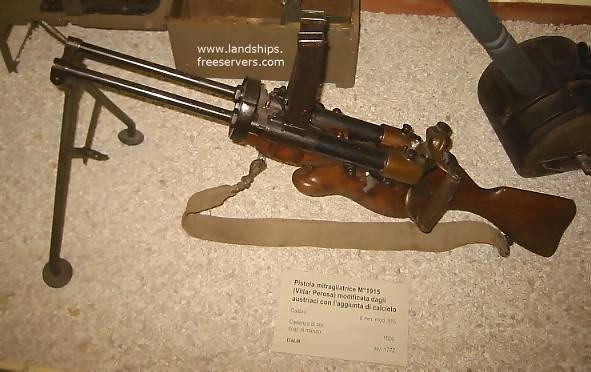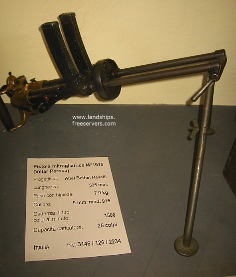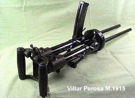 到了1915年5月23日,意大利加入协约国的一方而向奥匈帝国宣战。阿尔卑斯山的卡尔尼克和朱利安地区的山形地带提供了理想的防御环境,结果虽然意军兵力大大超过奥军,但地形却是对防御一方的奥军有利。那一年从6月到12月间一系列毫无建树的进攻行动当中,意军的损失就超过了两万七千八百多人。当时意大利人想到,要是有一种能够供单兵携带和发射的轻机枪就好了。于是一种单人携带、手枪弹的“冲锋枪”在1915年的年底(大概是在12月左右)被意大利军队采用。它就是维勒·帕洛沙Mod.1915(Villar Perosa),或简称为“V.P.”。