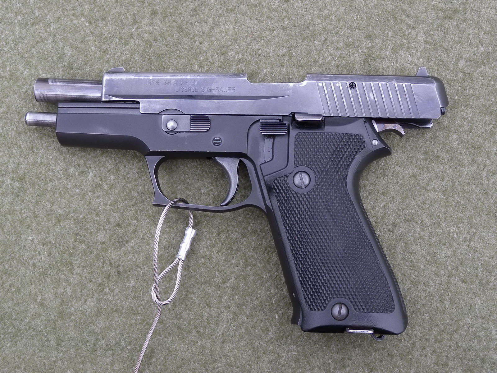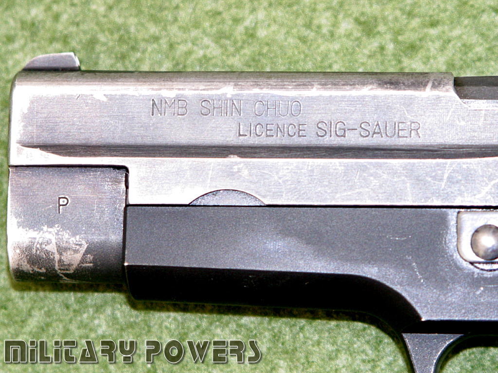 ![]() 9mm手枪套筒左侧上有生产商的英文NMB SHIN CHUO和LICENCE SIG-SAUER |