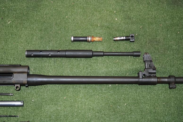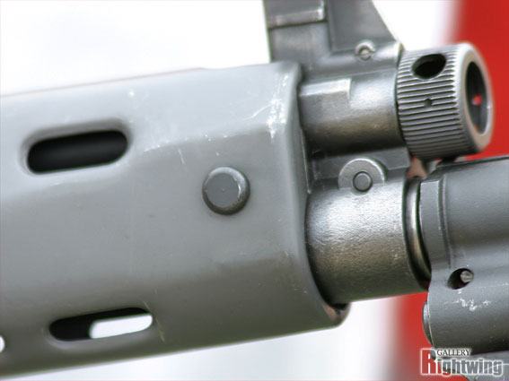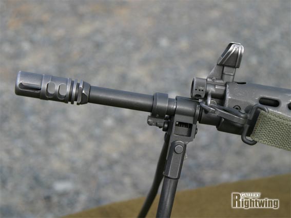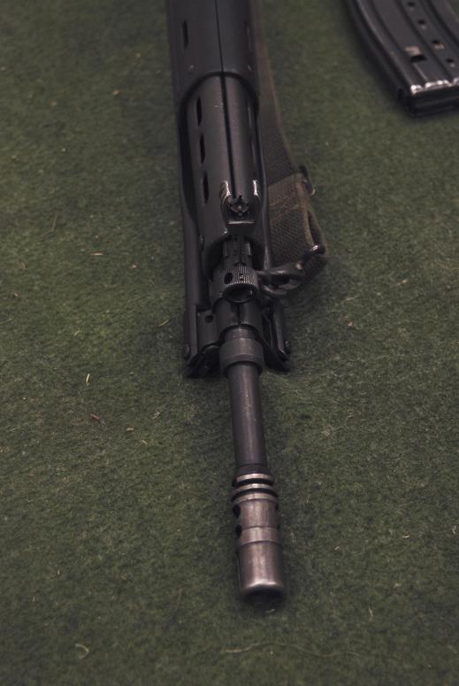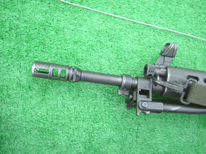 枪口处安装有消焰制退器,同时也是枪榴弹发射器。消焰制退器内部与M16的消焰器有同样的锥度,里面刻有用来固定空包弹助退器的螺纹。
