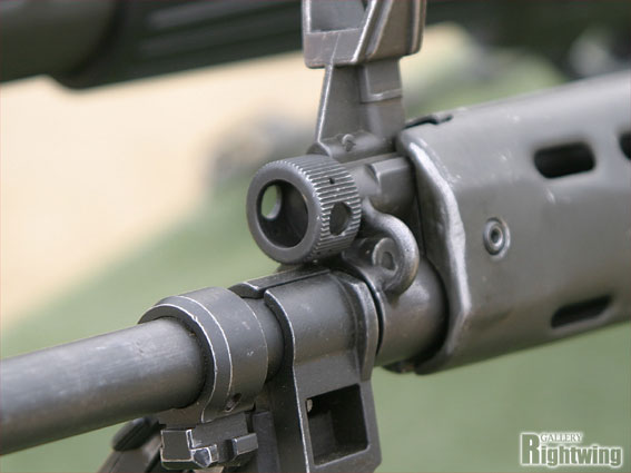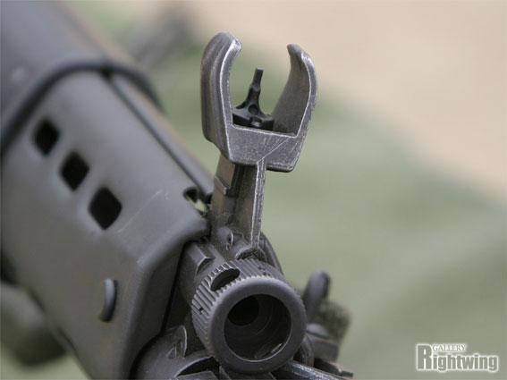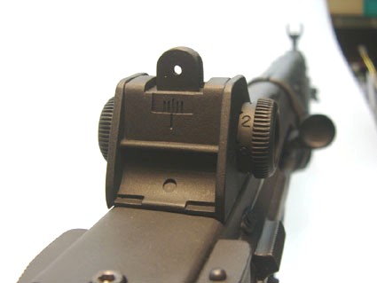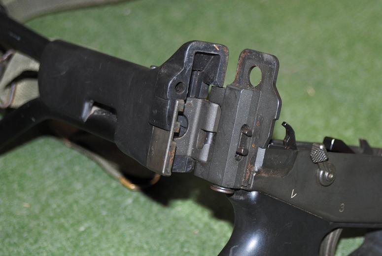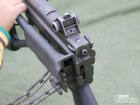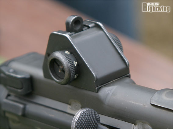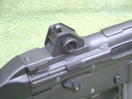 机械瞄准具由方柱形准星和觇孔式照门构成。柱状准星可作上下调整,调节方法和M16的相近。照门左右两侧有两个旋钮,左侧用于上下调整,右侧用于左右调整。旋转左侧的上下调整旋钮,将照门上升到最高位置之后继续旋转就可以让照门返回最低位置。另外,在握把中贮存着涂上夜间射击用荧光涂料的夜间瞄具,必要的时候可以与原先的准星及照门替换使用。