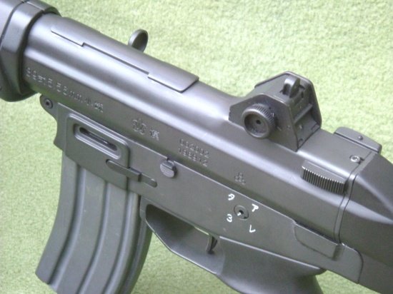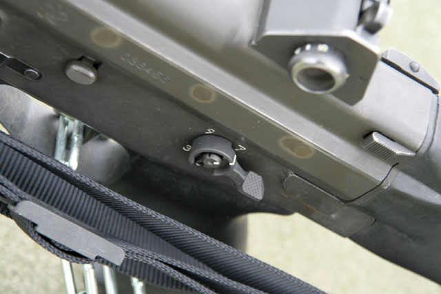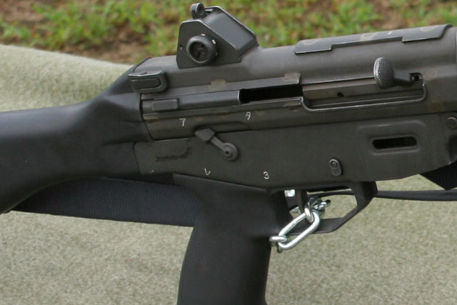 快慢机柄位于下接收器的右侧,按顺序有4个档:标记“ア”为保险,“レ”为全自动,“3”为3发点射,“タ”为半自动,有意思的是“アタレ”合起来也可作“当たれ”或“中れ”(击中、命中)的解释,这算是讨个吉利吧。其实在HR-15之前的枪机的快慢机是在机匣左侧的,可以用右手拇指操作,但在HR-15样枪之后却不知道什么原因而被移到机匣右侧(有一说法是早期样枪在部队试验中,在持枪匍匐前进时会不慎触到快慢机)。在派驻伊拉克的自卫队那里发现有左、右侧都有快慢机柄的89式,可能是应部队要求改进的。