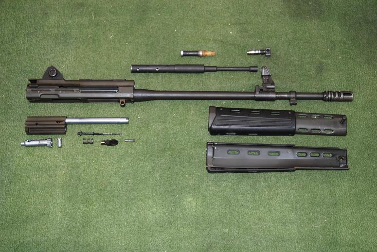 护木由左右两块组成,拔出护木前方的销子可以进行分解。金属护木的后半截外面包裹上塑料以改善手感。在护木上除开有散热口以外,还保留了一定空隙以防止内部的热量直接传到护木的金属部分上来。