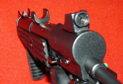 机械瞄具为带护翼的光纤准星及觇孔式照门,表尺有50米和100米两档。侧折叠式枪托由钢制成,并有塑料的托底板。和HM-3一样,枪托折叠在枪身左侧后,托底板也可以充当前握把,不过在护木底部也增加了可拆卸的垂直前握把,该前握把还可换成战术灯或激光瞄准装置。