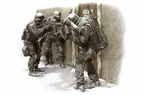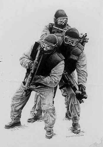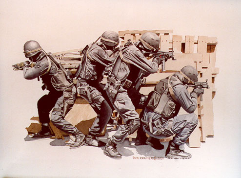 本来这个网站主要是介绍枪械而不是美术的,不过我在收集HK ITD的资料时发现迪克·克拉默的照片,这里参观的枪迷之中一定有不少特种部队迷的,所以就把这些照片贡献出来让大家分享。这些照片都作了处理,是不是看得很不过瘾呢?没有办法,因为他的摄影工作室网站正在贩卖这些高清晰的照片,还有印着这些照片的咖啡杯、T恤、鼠标垫和纪念卡等等,所以这些样板都被作了处理。迪克·克拉默经常为执法部门、军事单位、消防队等单位拍摄照片,而且还常常被一些枪械或战术装备的制造商和销售商拍摄宣传照片,HK公司就是他的常客。