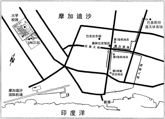当索马里炮手击落游骑兵特遣队用于实施穿插任务的UH-60“黑鹰”直升机后,游骑兵特遣队的任务性质便发生了变化。他们现在要执行的是救援和后送任务。游骑兵队员迅速撤离原定目标奥林匹克饭店、赶到直升机坠机地点,执行现场保卫任务。在那里,他们与一支人数超过他们的敌部队遭遇,伤亡惨重,陷于困境。又一架“黑鹰”直升机在距第一个出事地点以南约一公里处被击落,称为第2坠机地点。(见图1)