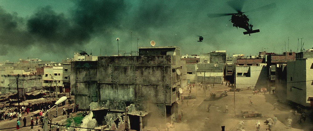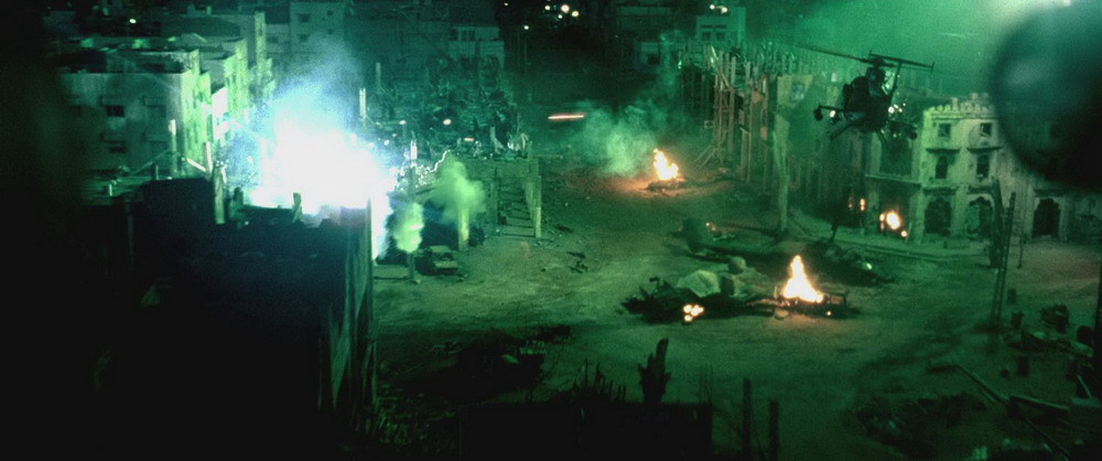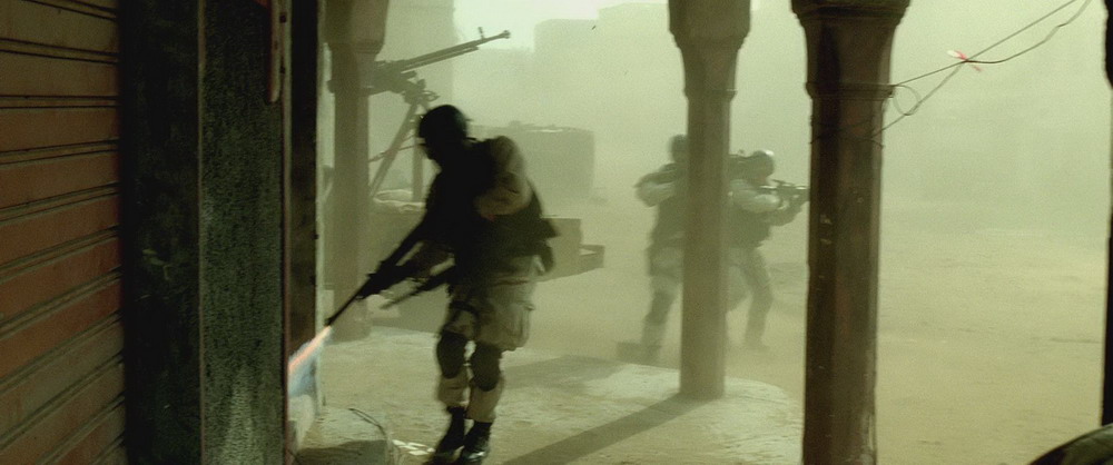 下图为一个公映的版本中被剪掉的镜头,这一组突击目标建筑的镜头真实地再现了原著中的描述:由于直升机卷起的尘土,负责突击目标建筑的三角洲队员一开始冲进了错误的房屋,当他们重新进入真正的目标建筑并逮捕目标时,又被Chalk-2当成索马里民兵而向他们射击。演员们在布拉格堡进行CQB训练的成果都展现在这组镜头中,在公映的版本中大家看到有一名三角洲队员老是背着一把没有用过的霰弹枪,其实就是在这个片段中用来破门的。对于这个片段被剪掉,也许这几个演员和他们的CQB教练都很不高兴吧。导演解释说剪掉的原因是认为这些场面使内容变得过长,既不好玩又不是好的一面,转换到下一个场面又显得太混乱,总之都是出于艺术角度的考虑了,其实我个人觉得这个3分14秒的精彩片段被剪掉实在是太可惜了。后来在导演剪辑版中虽然重新加上了霰弹枪破门的一段,但攻错目标房这段还是没加上去。
