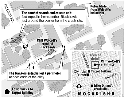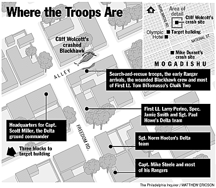 除了运送Chalk-4(4号机小队)的直升机稍为迟了一点外,所有的直升机都在预定时间和地点放下三角洲队员和游骑兵。下图说明了行动时的部署情况:MH-6和MH-60直接把三角洲队员运送到目标建筑前。Chalk-1由游骑兵指挥官迈克·斯蒂尔(Mike Steele)上尉和拉里·佩利诺(Larry Perino)中尉带领,以目标建筑的东南角为据点;Chalk-2由汤姆·迪托马索(Tom DiTomasso)中尉带领,在目标建筑东北角;Chalk-3由肖恩·沃森(Sean Watson)上士带领,在目标建筑西南角;Chalk-4由马特·埃利斯曼(Matt Eversmann)上士带领,原计划在目标建筑西北角,但最后的位置向北移出一个街区。护送车队停在目标建筑西南向的一个街区外等候三角洲队员的行动信号。