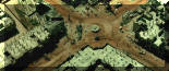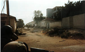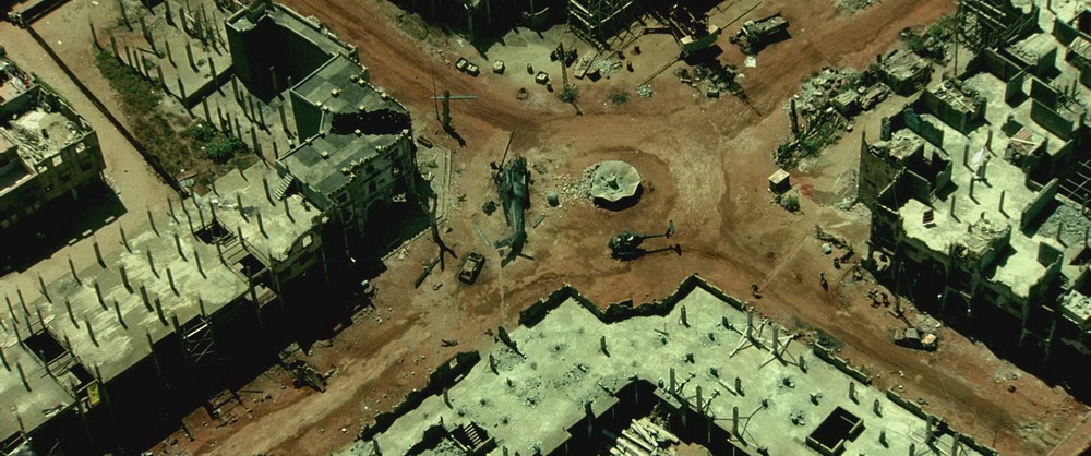 上图为电影中“超级61”的坠落地点,是位于一个宽阔的十字路口。左图为战斗搜索救援队垂降的示意图,说明他们并不是直接在“超级61”旁降落,而是在一个有掩护的院落内,周围有游骑兵Chalk-4的保护。而现实中“超级61”的坠落地点是在一条小路上(如下图)。事实上拍摄外景的摩洛哥的街道比真正的摩加迪沙街道要宽阔得多。至于“星41”则是降落在旁边的小巷中,而不是像电影中那样直接降落在“超级61”的旁边。