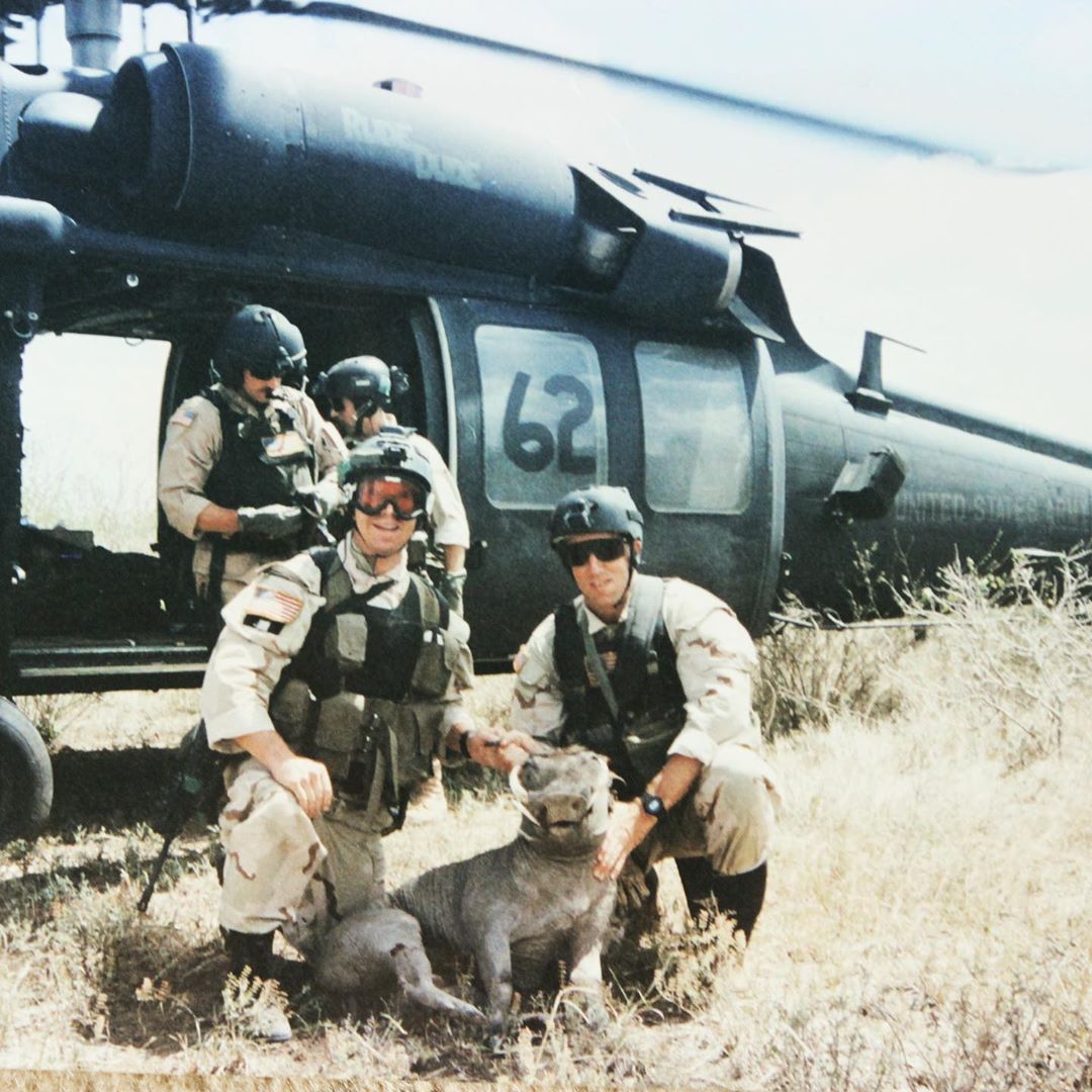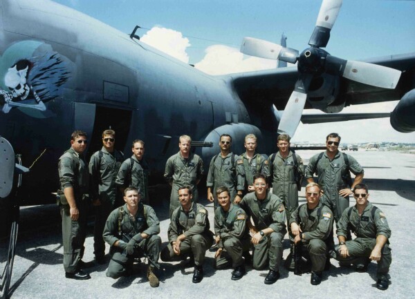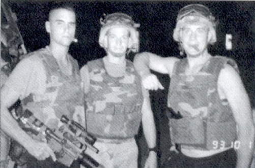 站着的3个人正好是“超级62”上的3名狙击手,从左到右分别为:布拉德·哈林、加里·戈登、兰德尔·舒加特,前面蹲着的那位叫丹尼尔·布什(Dannel D.Busch),在坠机后“超级61”中与索马里民后交火保护其他机组而阵亡