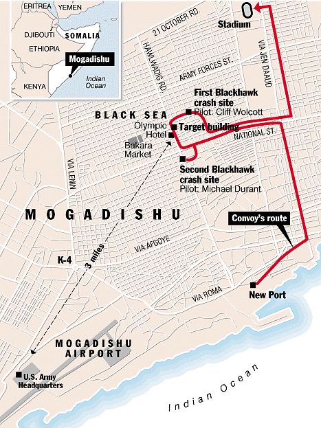 摩加迪沙地图,行动部队出发的机场距目标建筑约3英里,图中粗红线为第二批救援部队的行进路线,终点为露天体育场,图中可见索马里街道的复杂,而两个坠机地点位于目标建筑的不同方向上。