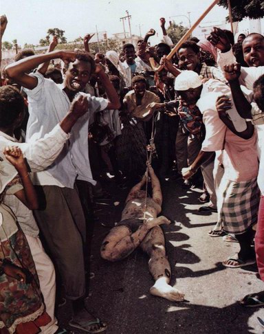 1992年,全世界都在电视中看到了骨瘦如柴的索马里人,其实在非洲许多其他地方的灾难都差不多,但如果记者的摄像机没有拍到,世人就觉得没有责任。国际社会认为应该为索马里人做点什么,于是救济物资开始到达索马里。但军阀们并不关心平民百姓的生死,他们只想养活自己的战士去夺取更多的地盘,于是救援人员被枪击,粮食被抢走,志愿人士不得不撤出了索马里。