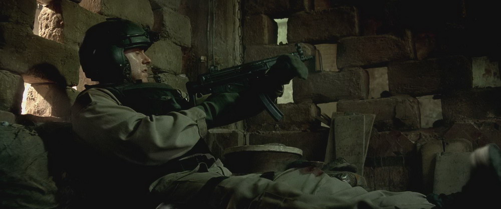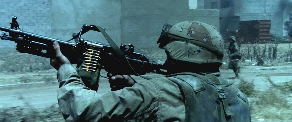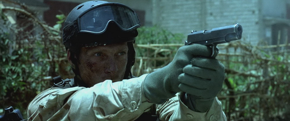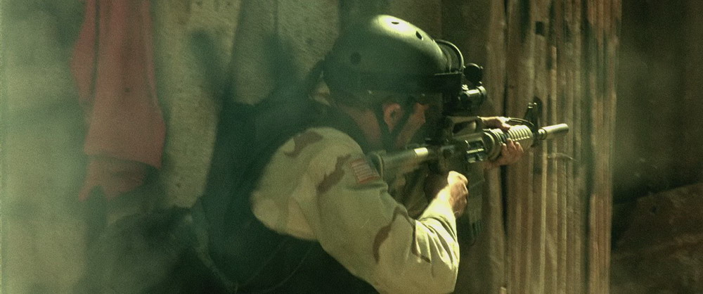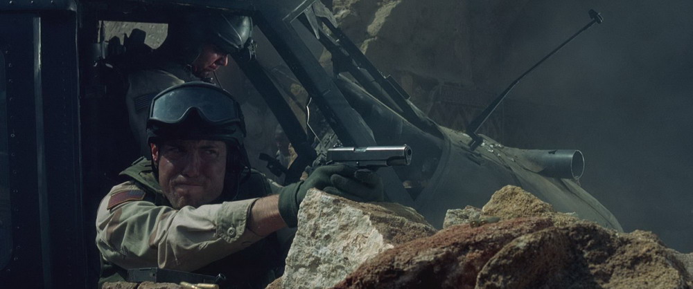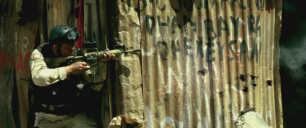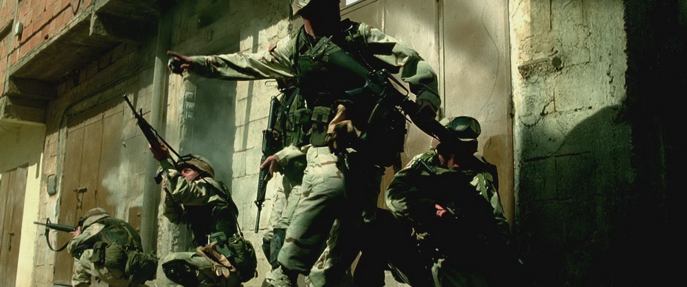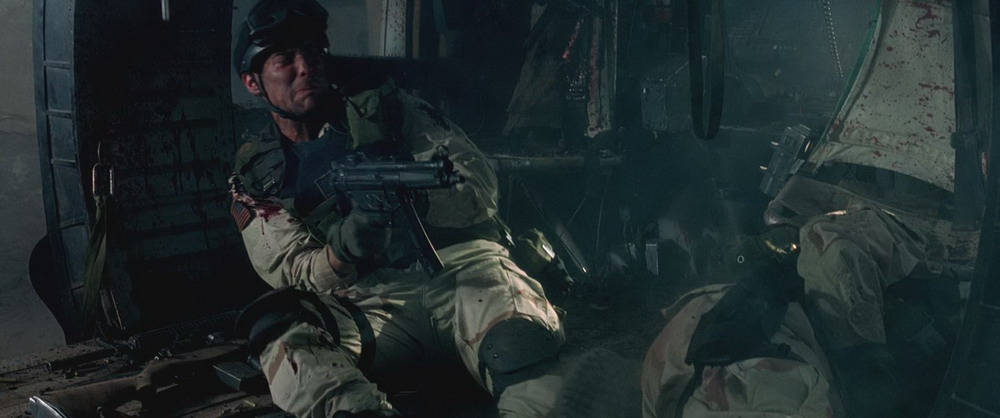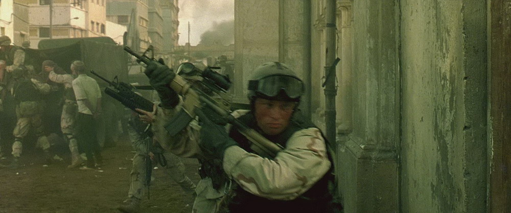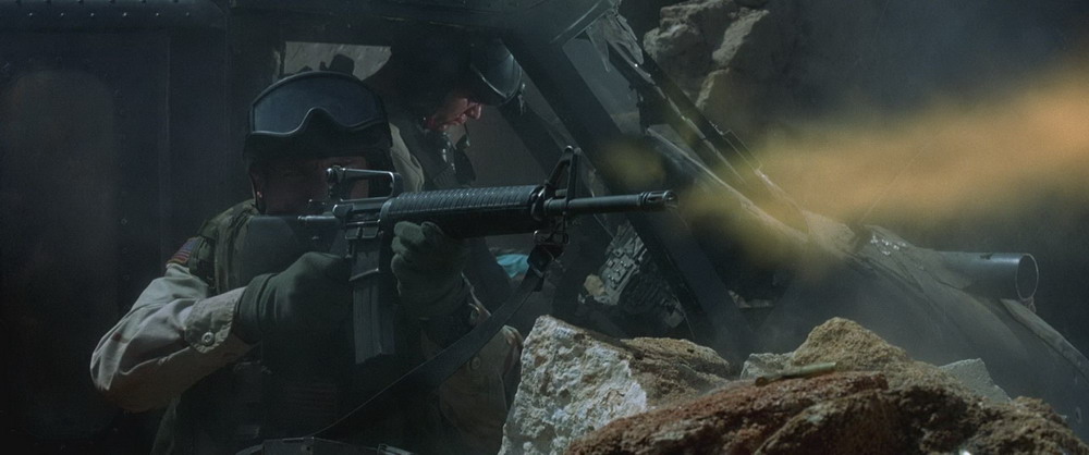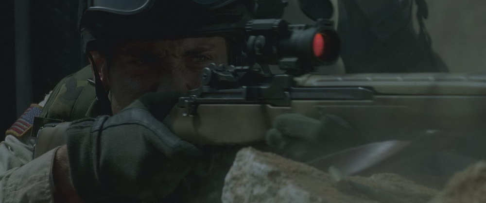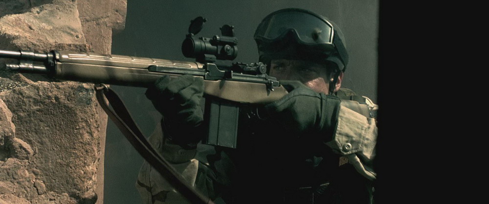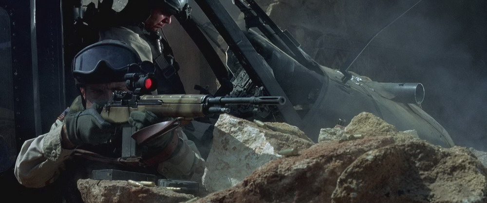 电影中有一幕是埃利斯曼上士用M16A2射击的镜头,这是电影中为了对比三角洲与游骑兵战技水平差异而编造的一个细节,游骑兵只能抵右肩射击,因此在利用障碍物左侧掩护射击时就出现了这种尴尬的射击姿势,而另一组镜头中三角洲队员则左右手都能射击。事实上,在美国陆军的M16手册中就鼓励普通士兵都应该学会两手射击,以便在城市环境战斗中有效地利用地形及各种掩护物。