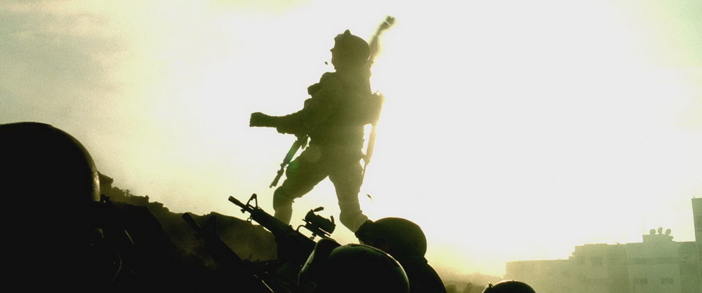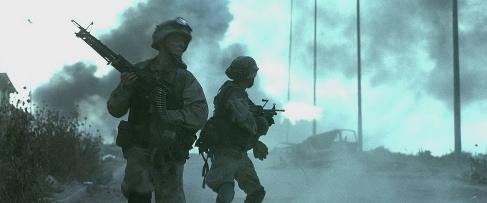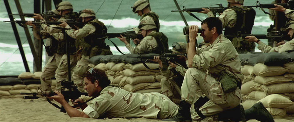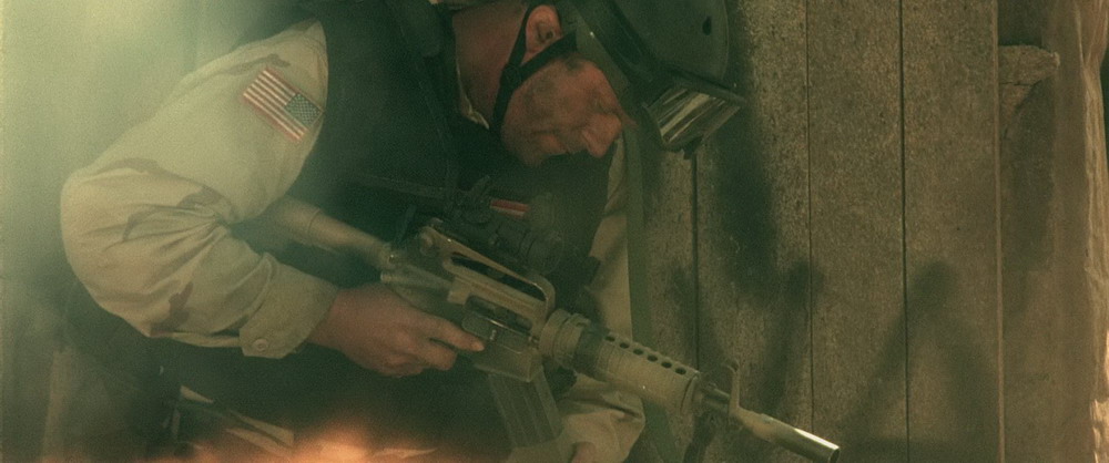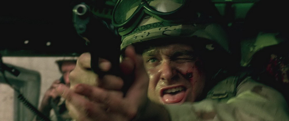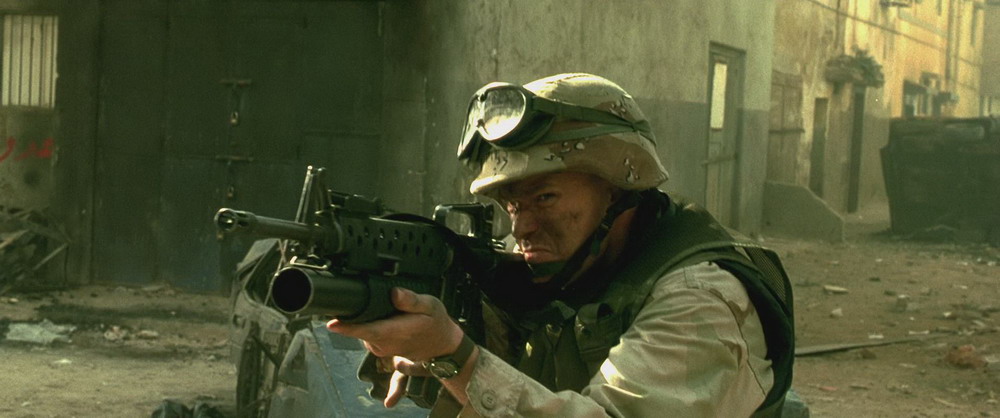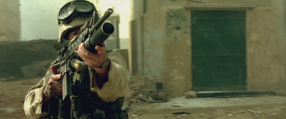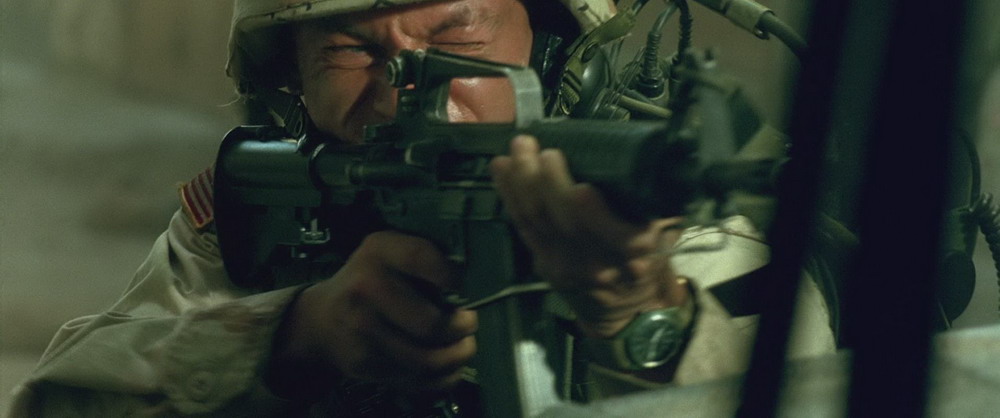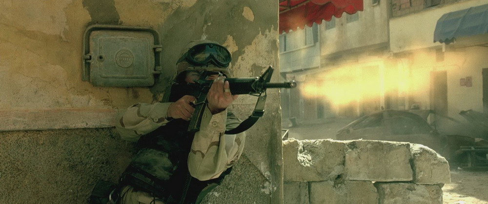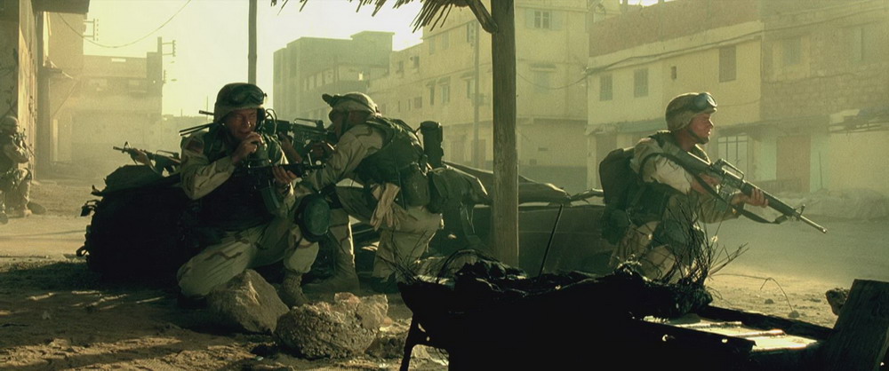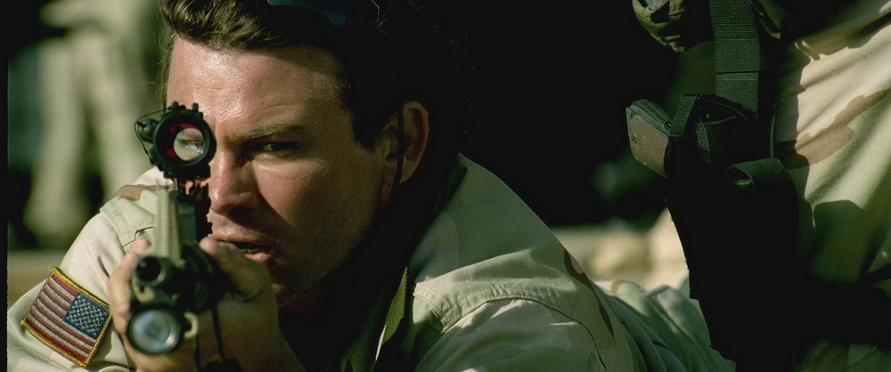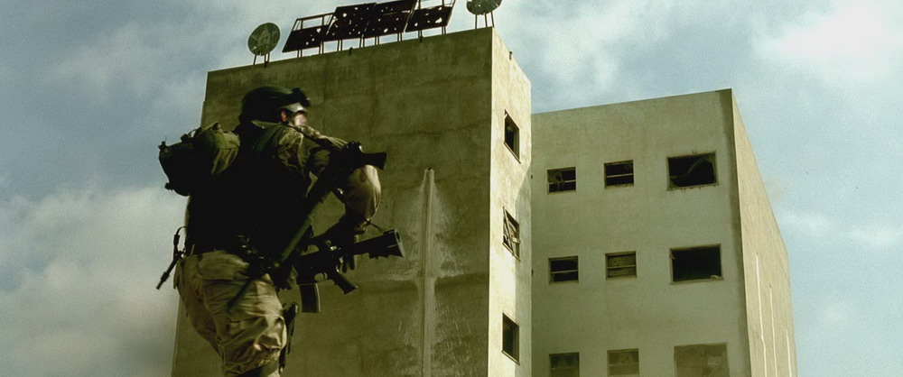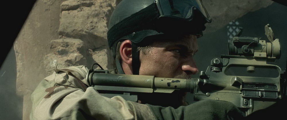 电影中有一幕是埃利斯曼上士用M16A2射击的镜头,这是电影中为了对比三角洲与游骑兵战技水平差异而编造的一个细节,游骑兵只能抵右肩射击,因此在利用障碍物左侧掩护射击时就出现了这种尴尬的射击姿势,而另一组镜头中三角洲队员则左右手都能射击。事实上,在美国陆军的M16手册中就鼓励普通士兵都应该学会两手射击,以便在城市环境战斗中有效地利用地形及各种掩护物。