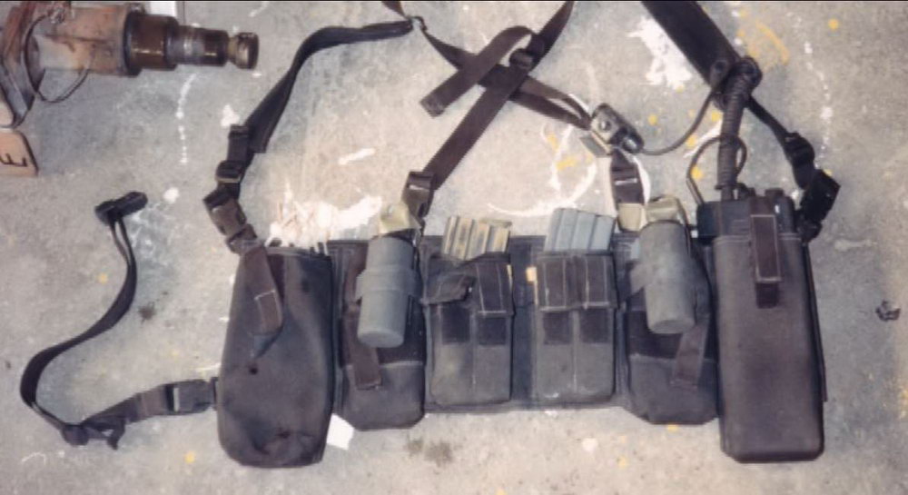 【历史照片】上世纪90年代三角洲队员所使用的AWS Strike胸挂弹匣包的照片,图中看到在电台包内侧的弹匣包外面,捆绑了两枚AN/M14铝热燃烧手榴弹。而电影中演员所穿的黑鹰胸挂的弹匣包上是有掩盖的