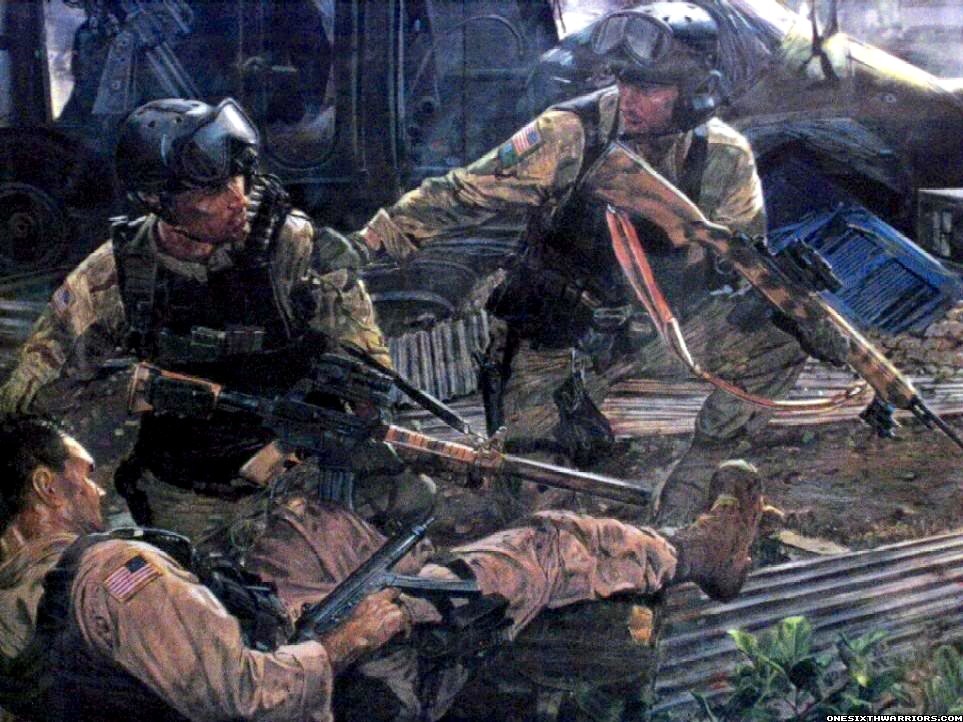 描绘加里·戈登和兰德尔·舒加特尝试保护超级64坠机地点的战斗场面的油画,画家准确地画出了戈登所用的CAR-15是安装OPS 3RD消声器的723型卡宾枪,提把上是AIMPOINT 5000红点镜,舒加特使用的是同样安装AIMPOINT 5000红点镜的M14,导气箍下面还挂着AIM-1红外激光指示器,而飞行员杜兰特手上拿着MP5A3。