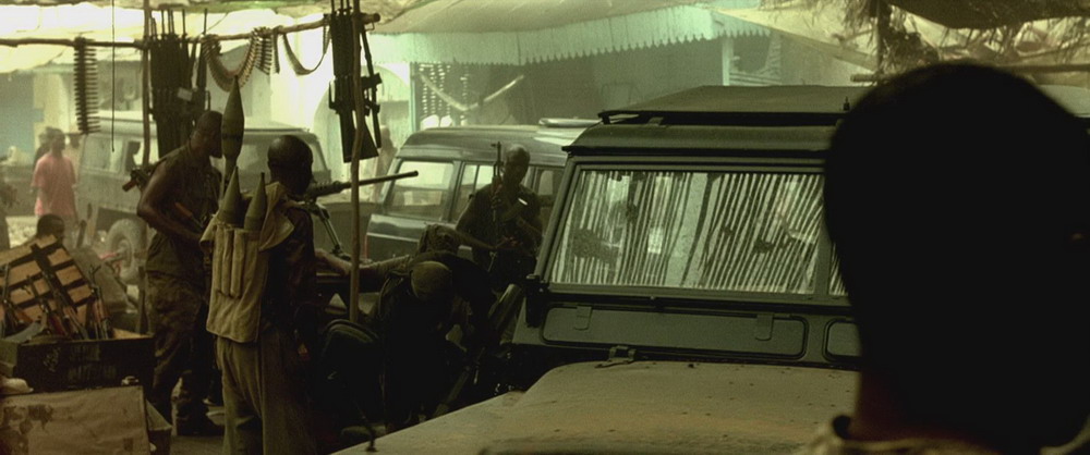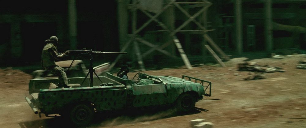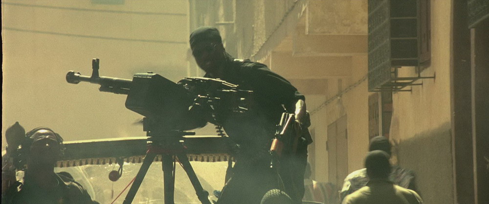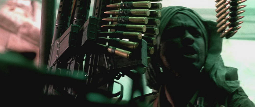 索马里人主要的重型武器就是这种在后面装有一挺重机枪的小型卡车,这种打了就跑的“技术装备”是在战乱的非常国家是非常流行的,电影中的卡车上的重机枪有一部分是苏制的德什卡12.7mm重机枪(从方形的受弹机盖判断这是DShKM型),另一部分则是M2HB,这些武装车对美军构成很大的威胁,直升机是对付它们最有效的武器。