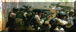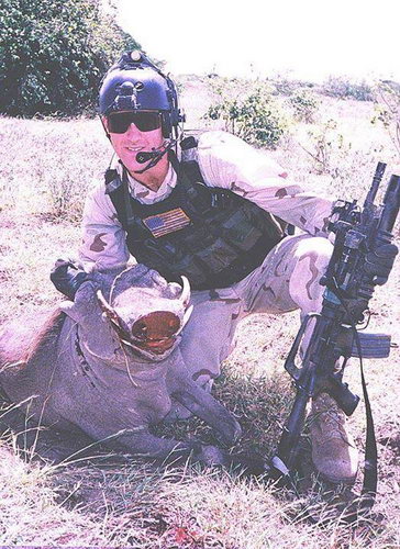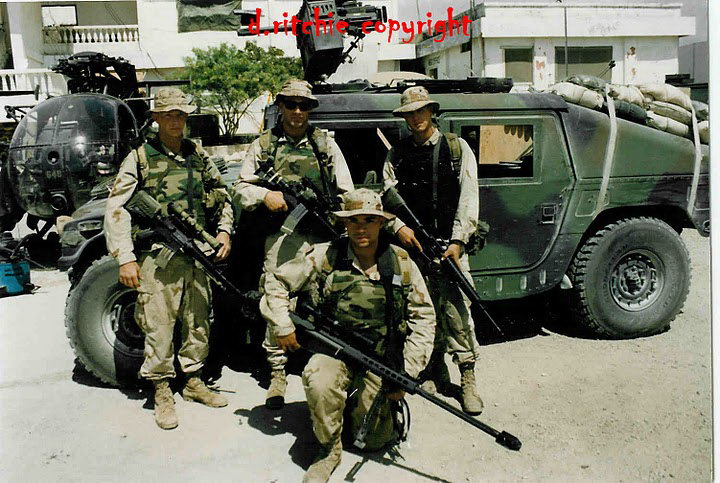 【历史照片】这是一个游骑兵狙击小组,背景HUMMV车顶的Mk19和前面的士兵手上的巴雷特M82A1都是没有在电影中出现的武器。注意悍马车上的一个细节:在1993年,装甲型悍马还未装备(事实上正是吸取哥特蛇行动的经验,才研制和装备装甲型悍马),当时游骑兵们是在车门和车尾绑上后备的防弹衣及沙袋来提供防护能力,因为普通悍马车只是个薄皮铝合金的轻型车,完全没有防护能力。但车尾捆上沙袋后,尾门就无法即时打开。