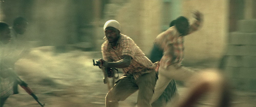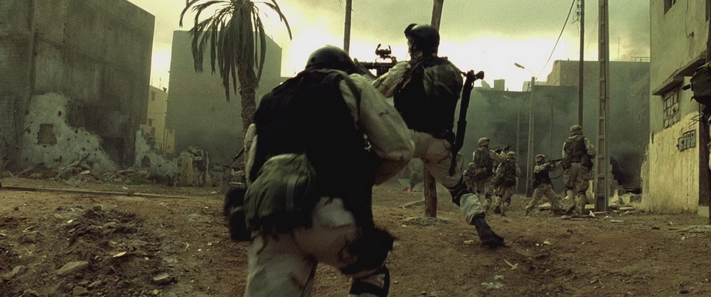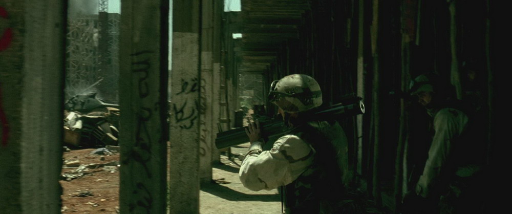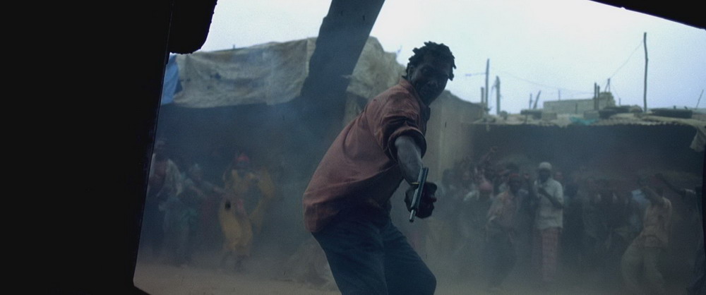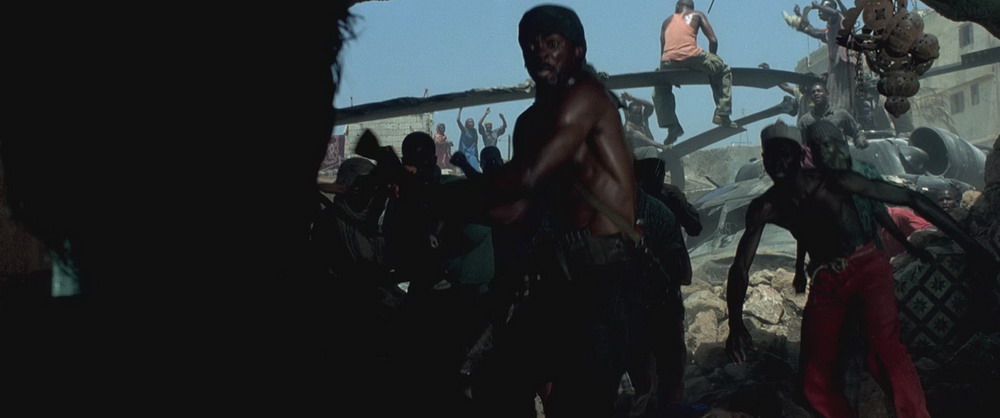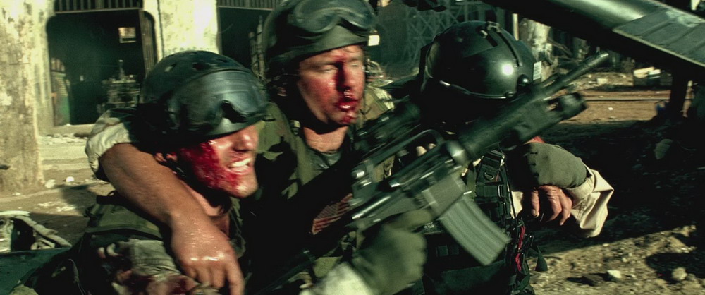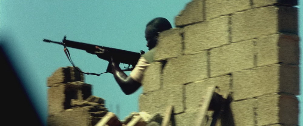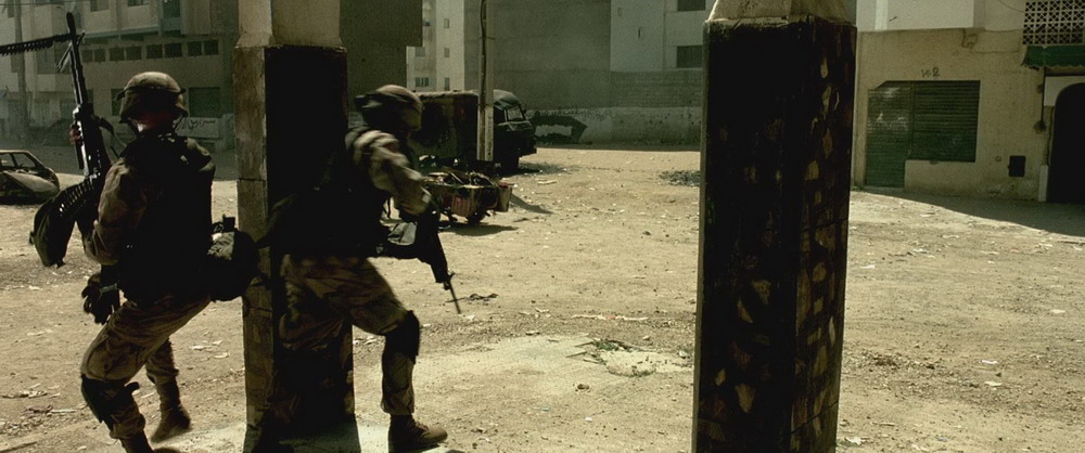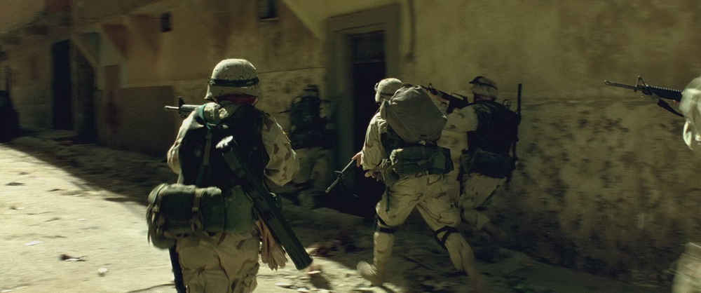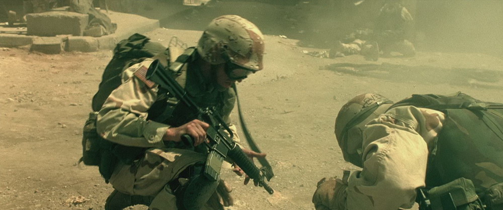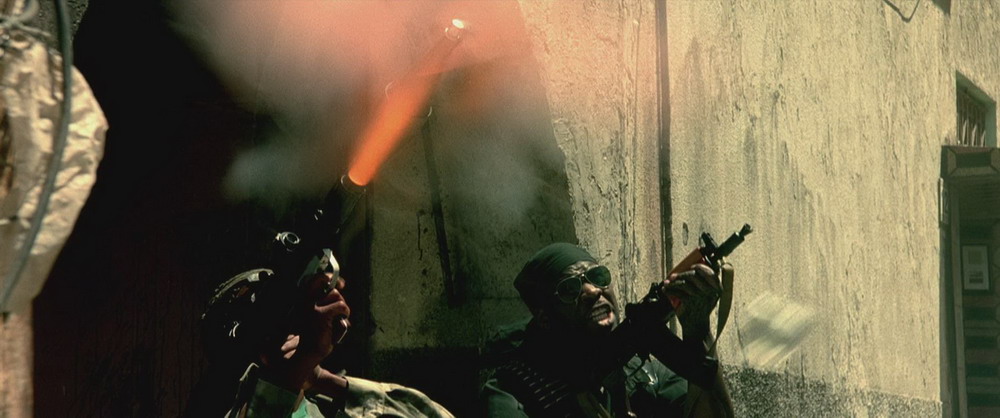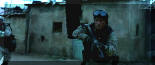 在下面这个镜头中,这个索马里民兵被M16A2击中后还能拖着AK逃跑,其实在前面的情节中有一个被剪掉的镜头为此埋下了伏笔:三角洲队员贺维往弹匣里装涂有绿色标记的子弹时(M855普通弹的弹尖标记),舒加特说索马里人不穿防弹衣,这种弹头会直接穿过去,要几发子弹才能射杀一个目标。事实上事后就有参战美军报告M855弹的杀伤力不足,有些时候要打中4、5发子弹才能使一个敌人失去战斗能力。电影中就有这样一个场景。