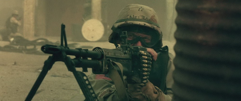 电影中多处出现了M203榴弹发射器(但有个别镜头中出现的是民用的37mm CM203,可能是这家道具公司没有足够的40mm M203道具),但这种武器射击的场面并不多,最紧张的一个就是士兵格里姆斯(Grimes)与两名操纵武装车上的索马里机枪手比赛装弹速度的镜头。事实上,在原著中记载这一段的战斗过程倒是比较单调的:当尤瑞克看到两名索马里枪手用一挺用架设在地面上的重机枪封锁了整条街道,于是就以一辆大众汽车为依托,先是用自己背着的M72反坦克火箭筒射击那两名枪手,但并没有消灭他们,然后他又拿出另一支火箭筒,但发射筒变形拉不开,于是他就装了一发40mm榴弹,用M203一炮消灭了这两名索马里枪手。电影中,这个镜头换到格里姆斯身上。