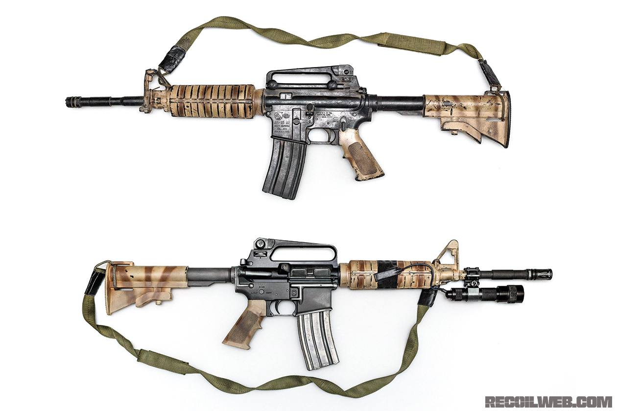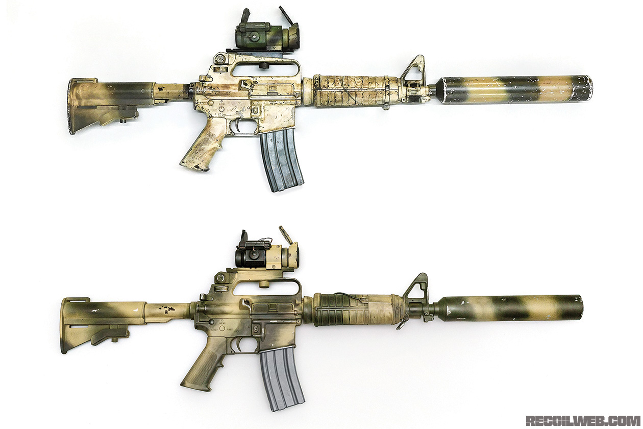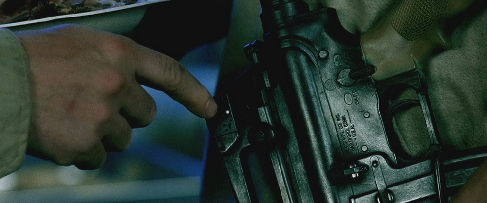 这部电影里的武器是由一家叫Zorg Limited的道具公司提供的。2020年RECOIL网站上有文章揭秘,才知道电影中的CAR-15全是用M16A2改装的假货。这批道具枪是从危地马拉退役的出口型M16A2买回来的,游骑兵所用的M16A2还好弄,只要挂上枪带就可以了。而其他的无论是727型和装上消声器的733型都是换短枪管、短护木和伸缩枪托改装而成的(但有几把没有喷涂迷彩的733型是原装道具枪),还改得像模像样。至于兰德尔·舒加特的M14,道具本体是半自动的M1A,但道具公司在相应位置上从枪托切出一个坑再粘上一个假的快慢机,看起来就像真的M14一样。不得不赞叹一句道具师傅的手艺真好、真用心。 但使用M16A2改装出的CAR-15,也说明了为什么电影中三角洲队员的CAR-15都是727型而不是723型的原因——换枪管、护木、枪托已经够花钱了,要是还要换上机匣,整把枪可能就只剩下下机匣是原装的了,那还不如直接搞一批M16A1来改装。