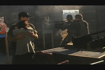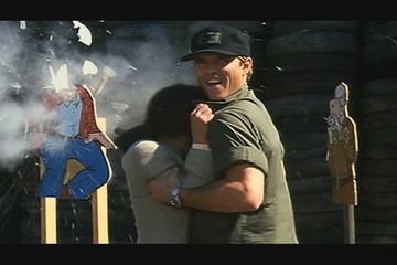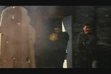然后当主角之一的小队长带女记者参观海豹基地时,就展现了几种训练场面,尤其是小队长与女记者在Killing House里体验枪林弹雨的那个场面更是让人印象深刻。据说许多精锐特种部队的实弹射击训练里都要有类似的练习——让活人呆在靶子旁。