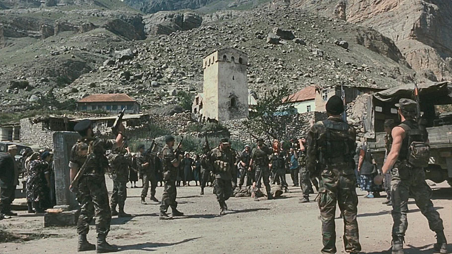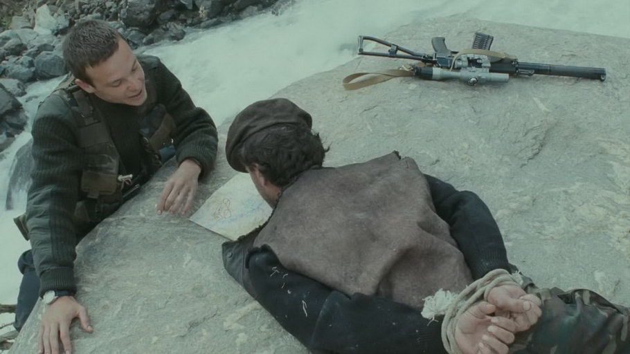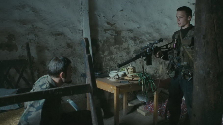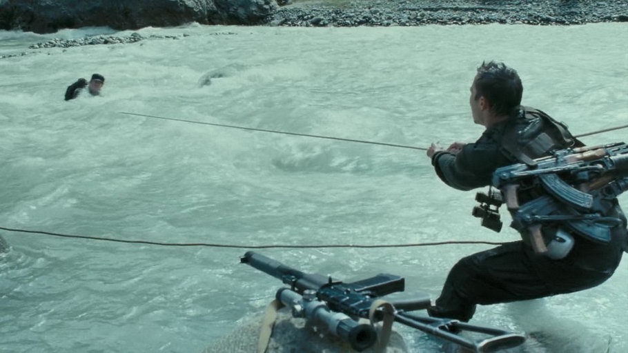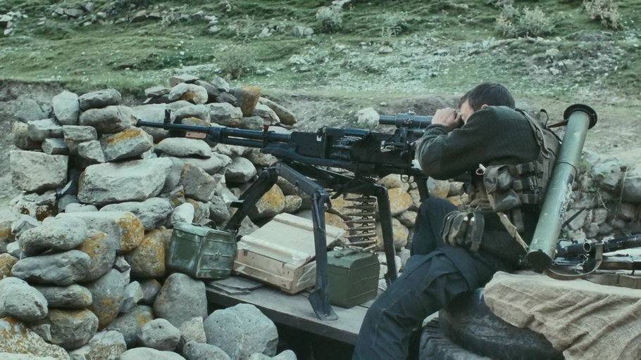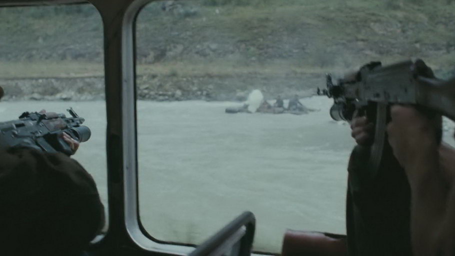 在偷袭村庄成功后,约翰等人在制作逃跑用的漂流筏时,艾云则在使用布置在村口的一挺NSV重机枪拦阻返回村庄的车臣武装分子。NSV 12.7mm大口径机枪也被称为“岩石”,其设计师尼克金、沙科洛夫和伏尔科夫在1950年代曾设计过一种7.62x54mm R口径的通用机枪,但在竞争中输给了卡拉斯尼柯夫的PK系列,10年后他们用同样的结构设计了一种大口径机枪,并在1970年代被苏军采用。NSV既可以射击低空飞行的空中目标,也可以对付地面目标,包括人员目标或具有薄装甲防护的轻型车辆。电影中的车臣武装分子把这挺NSV布置在村庄唯一的公路出口上,可用于对付乘车进攻的俄军。但这一挺NSV的三脚架是钉在一块厚木板上的,而木板本身并没有固定好,因此在射击时整块木板都跳起来,使艾云只能打短点射,而且点射间的间隔时间比较长,以便重新瞄准。对于导演这样的安排,我们只能猜测这伙到处打游击的车臣武装分子不把NSV固定在地面上是为了方便转移,如果俄军有强大兵力进攻时,只要连木板一起搬上卡车就可以跑了。