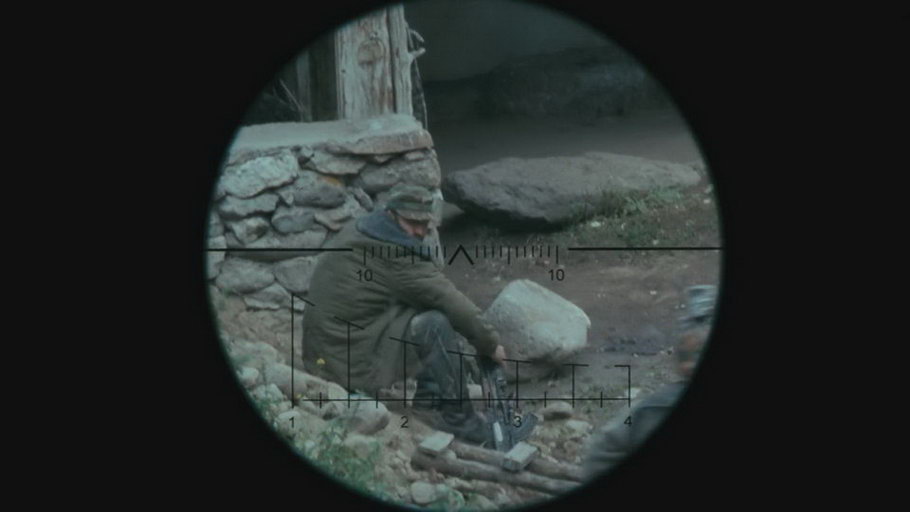 首先要提的是难得一见的AS微声突击步枪,但有一些人误认它为VSS微声狙击步枪。AS微声突击步枪在外形上与VSS微声狙击步枪最大的区别在于AS步枪采用了折叠金属枪托,不过由于本站上已经有专文介绍,这里就省点打字的功夫了。AS步枪已经装备了俄罗斯的特种部队及执法机构的行动单位,且在独联体各地的武装冲突中广泛应用,但在传媒的报道上很少能够看到这种枪的影子,事实上发射SP-5/SP-6的一系列特种枪械一直都很有神秘感。导演的想法大概是既然AS在车臣也大量应用,因此被车臣人缴获的可能性也是有的,因此就安排了一支AS突击步枪作为道具,并为艾云编了一个机会,让他在抢夺车辆的时就缴获了这把AS步枪。这把AS步枪配有一个6×24的POSP瞄准镜,在清晨偷袭车臣武装的村庄时起到重要作用。