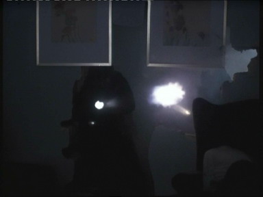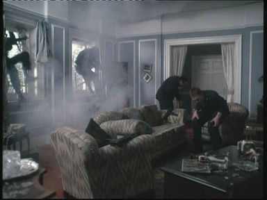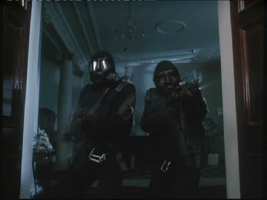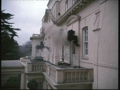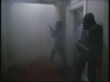 首先是营救主角的妻儿。化装成平民的SAS队员潜入主角邻居家里,他们先是慢慢地用手摇钻在墙上悄悄钻一个小孔,通过针孔摄像机侦察和监视人质及劫持者的状况。然后再用最轻最慢的动作花一整晚把墙壁拆薄,这样就可以用最少量的炸药来破墙,降低爆破时伤及人质的机率。突击行动时,先切断电源,紧接着炸通墙壁,趁着因为突然陷入黑暗和被爆炸声惊吓得不知所措的恐怖分子反应过来之前,两名突击队员手持手枪和手电筒通过墙洞迅速射杀恐怖分子,由于进攻发起前一直用针孔摄像机实时监视,因此他们在发起进攻时就很清楚恐怖分子和人质的具体位置。