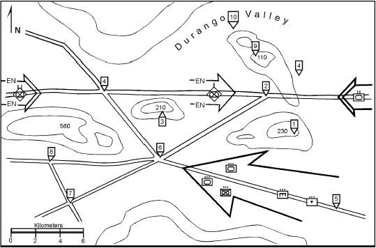 现在情况是敌FSE占领了有利地形,战术群可以选择打通cp2,也可以选择迂回北方的Durango谷地,但是无论哪种情况,都必须歼灭占领110高地(cp9)的敌人。为了更好的保障战术群投入战斗,从东面配合战术群的行动是必要的。