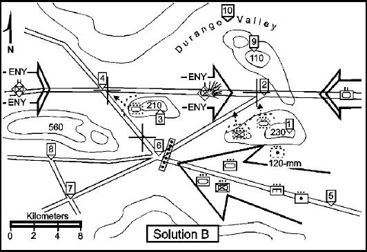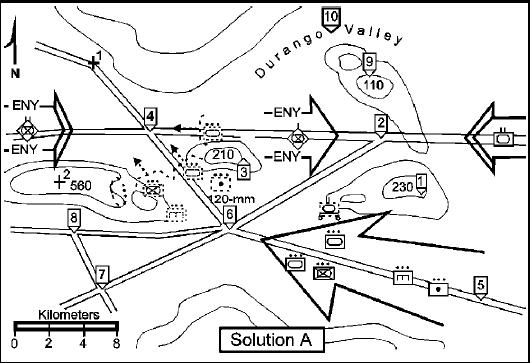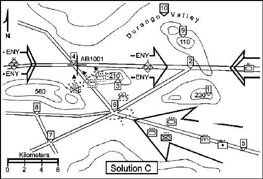 连向北机动咬住消灭敌人FSE是符合上级意图的:防止敌FSE咬住我们营并迫使营将注意力集中在cp2.连长认为他能消灭敌FSE因为他处于敌FSE侧翼,兰队前出210高地以监视敌AGMB并在其继续向西或者在cp4南下的时候迟滞之。如果敌AGMB向东北运动,营正好可以在cp2到cp10之间攻其侧翼。如果AGMB继续东向,那么营可以在cp9以南攻其侧翼。如果敌AGMB南下(多半是因为敌FSE被歼),敌人将被雷场和210高地的兰队迟滞,而这将给营提供在cp2绕过FSE残余力量病灾cp3或者cp4对其发动侧翼攻击的可能性。当然,达到任何一个目的,我们必须和营恢复联系