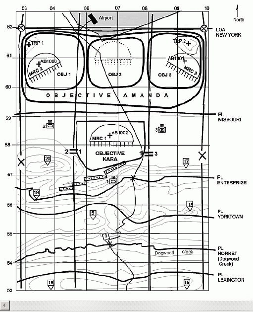 Kara东侧的MRP。你拥有迫击炮火力支援的优先权并负责呼叫迫击炮火力打击AB001 and AB003。你的部队刚刚在Lexington线展开并预期和敌人CSOP(淡泊注:不懂) (参见图2. 营形势图)建立接触。