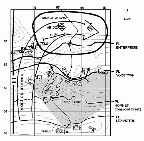 关键地形:Dogwood小河因为将阻碍我军机动,所以是本地域的关键地形。PL线(注:Phase Line,控制手段之一,在地图上设定一线,规定某时间之内应抵达)的山脊一线也是关键地形,因为它可以提供极好的北方视界,控制它的部队将获得因此带来的优势。