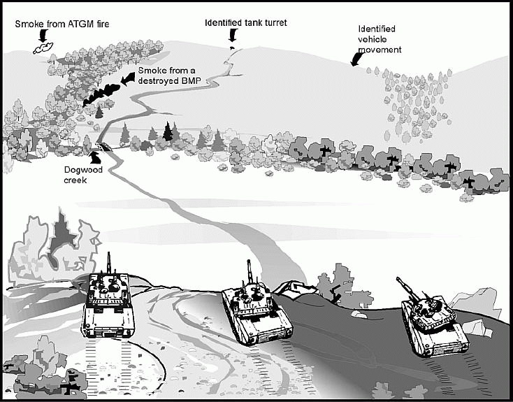 敌情:敌人在进行防御,目前还没有和我们接触。13th MRD(淡泊注:摩步师?)在Yorktown 线以北5公里部署了一支MRB先遣分队(淡泊注:摩步旅)来保护后勤基地(机场)。先遣分队在过去的24小时内已经为将要在12小时内到来的主力建立了临时阵地和障碍物。 我们的战术群(TF 1)将进攻敌先遣分队部署的一个用来来提供早期预警,削弱进攻者,并将敌人吸引到预设战场的MRC(淡泊注:摩步连)(沿Enterprise线)。MRC目前只有70%的兵力兵器。而且2小时前,我们一架UAV(淡泊注:无人飞行器)飞过MRC上空进行了侦查。MRC在其主防御地带前2-3公里部署了一支CSOP(Company Security Outpost,连警戒前哨)(沿Yorktown线)来提供早期预警并呼叫间瞄火力打击我方运动部队。CSOP是一个由1辆坦克加强的MRP(淡泊注:摩步排)。