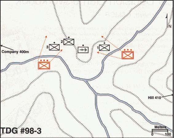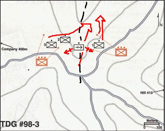 我觉得,此时由于伤亡人员已达6人,不丢弃伤员的情况下速度一定不会太快。而我方虽然是被分隔为两个部分,但是是被地形而不是被火力分隔,这就好办。应该以最快的速度收拢部队。而且从敌人开火方式看敌人应该没有火炮支援,不过丛林地区似乎迫击炮也施展不开,所以双方能使用的只能是轻武器。 |