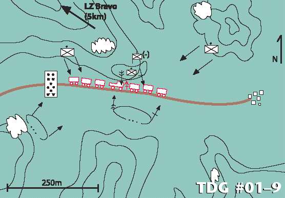 本连加强有2个中型机枪组和2个突击组(武器类似于RPG),准备对已知的敌军补给路线进行夜间伏击。作为连长,我有夜视仪。我们布设了绊发、压发防步兵雷、反坦克雷,我们的通讯网可以和营指挥部以及排长们通话。据情报,敌人的补给是靠卡车运输的,有时有武装吉普或装甲汽车作护卫,兵力通常是一个减编步兵排,车队一般是6-8两车。连在0135由直升机运送到b着陆区,离伏击点大约5公里。地形为山地,乱石嶙峋,灌木低矮,夜间温度接近或低于冰点。分队在山脊线以下以纵队行军。一到伏击区,一个排就进行了侦察并在地图上绘制了阵地的轮廓图。我们尽量减少无线电通话,使用通信员和化学荧光棒通信。天仍然很黑,敌军的车队“如约”从村庄出发而来,我没发现吉普或装甲汽车。车队进入了杀伤区,指挥部打想了第一枪,战斗开始。敌军被压制的很难抵抗,但车队中央的一辆吉普车上有人用重机枪进行半自动射击,很快被我们压制了。我们只有1人阵亡,1人重伤,4人轻伤。在对伤员包扎后,我们进行了快速的搜索以查找情报线索,没发现什么,但确认摧毁了一辆装有重机枪的吉普车。搜查后,我们走另一条路线返回b着陆区。我们把地雷留在了现场。这次行动很成功,是不是?