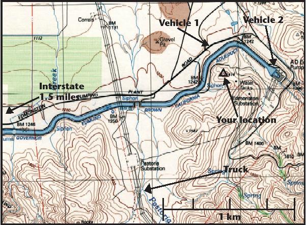 对Smith上尉:“我们得准备一个撤退计划以防坏蛋们发现我们,他们会从Pastoria变电站包抄我们,或者1组人穿越aqueduct从东南接近。我想我们没法互相支援,所以我们要在情况紧急的时候分开,我想最好的路线是沿山脊向西南,但是,如果他们切断我们,就要按直觉去做了。你有什么主意?”