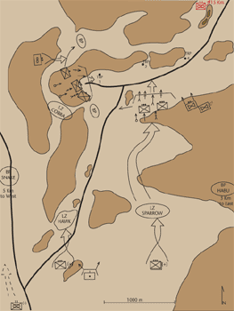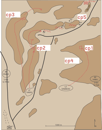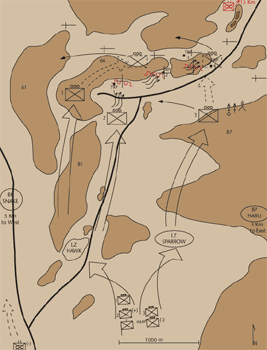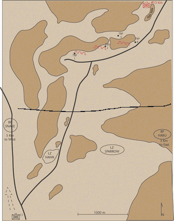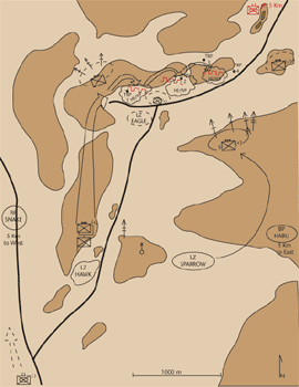 “60mm迫击炮排和M2 .50机枪也在LZ Sparrow 进入,并在LZ正西小丘设立战斗阵地(battle position (BP)),在那里他们为进攻提供支援并作为我们后方的OP。