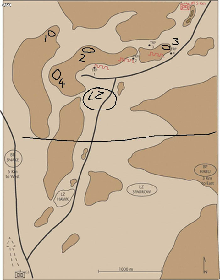 “0400,第一波直升机会到达指定LZ,在 LZ周围,先期到达部队要建立仓促防御阵地。在连队在地面重整后,我们用战术总队向目标前进。1排离开LZ后向西运动,在山脉西侧向敌人左翼接近 。他们将建立防御阵地以切断敌人退路。主力从正面接近,东方山顶将建立一个临时观察点(OP)。
