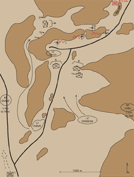 “在0400,固定翼飞机和炮兵连开始从东攻击 1、2、3、4号目标参考点(TRP)并消灭BMP,削弱支撑点的兵力兵器。 AH–1分排从南协助攻击, Huey则担负初期火力协调的指挥控制任务,并在0500时,机降完毕后向地面转移控制权。Hawk组向北机动2km并在敌支撑点左翼设置一临时阵地,然后开始攻击敌人余下的目标。Sparrow组向北运动1.5km并在敌支撑点南面设置一临时阵地, 然后开始攻击敌人余下的目标,并监视敌人可能的机步营反击。一旦摧毁敌支撑点, Hawk组向北运动,警戒并在北方山谷通道准备阻击。Sparrow组向西运动,在道路左侧建立阻击阵地 ,并攻击东北方任何看到的敌人。在Hawk LZ正北方建立Cobra LZ同时为Hawk组和Sparrow组提供补给。”