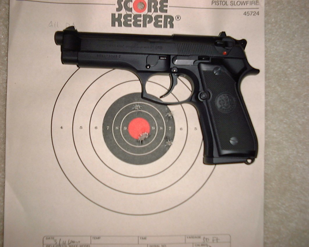 这里再谈谈枪的选择。这里说的选择枪跟我过去评枪的观点完全不同。这里不是选择一枝最好的手枪,而是选择一种适合训练的枪。读过我的文字的人恐怕都知道本人是 Sig P210 的迷。这里我决不推荐你用这种枪作为主要练习用枪,同时也不赞成使用其它单动击发手枪或者H&K P7系列。因为这些枪的扳机相对很轻,射击练习相对容易。如果你掌握手枪射击准备有一天实用的话,你最好有能力运用所有手枪,而不是你自己的那支专门的手枪。所以我的选择是勃瑞塔92FS。首先它在现代手枪中的准确性是第一流的,第二它是现代手枪当中扳机最硬的,双动时为14磅(而且还十分生涩,本人认为这是它的最大缺憾),单动时为7磅(远远高于普通观念上的最佳点4磅),尽管这对枪本身来说可能是一种缺点,但是从训练的要求上却是最佳选择。