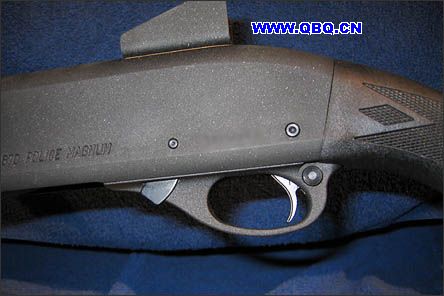 雷鸣顿870的扳机部位。左边的片状部件就是枪机解锁片(如果击锤顶起的话,必须按下这片东西才能拉动解锁枪机)。右边的圆形按钮是保险。