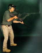 这种姿势适合没有手枪握把的“传统”霰弹枪。具体做法是:枪托处于腰间的高度,枪口向上抬,前准星和视线平齐。眼睛扫视前方的时候,虚化前准星,不让它阻挡视线。一旦发现需要瞄准开枪,左手立即把枪向前推出,右手把枪托上抬抵肩。这个动作经过多种比赛和实战的考验,证明也是速度较快的。而且,这种姿势的一大优点是不容易被人夺枪。就算没有防备的时候被人抓住了枪身,也不容易脱手。