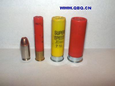从左到右依次为:.45 ACP,.410霰弹,20号霰弹,12号霰弹